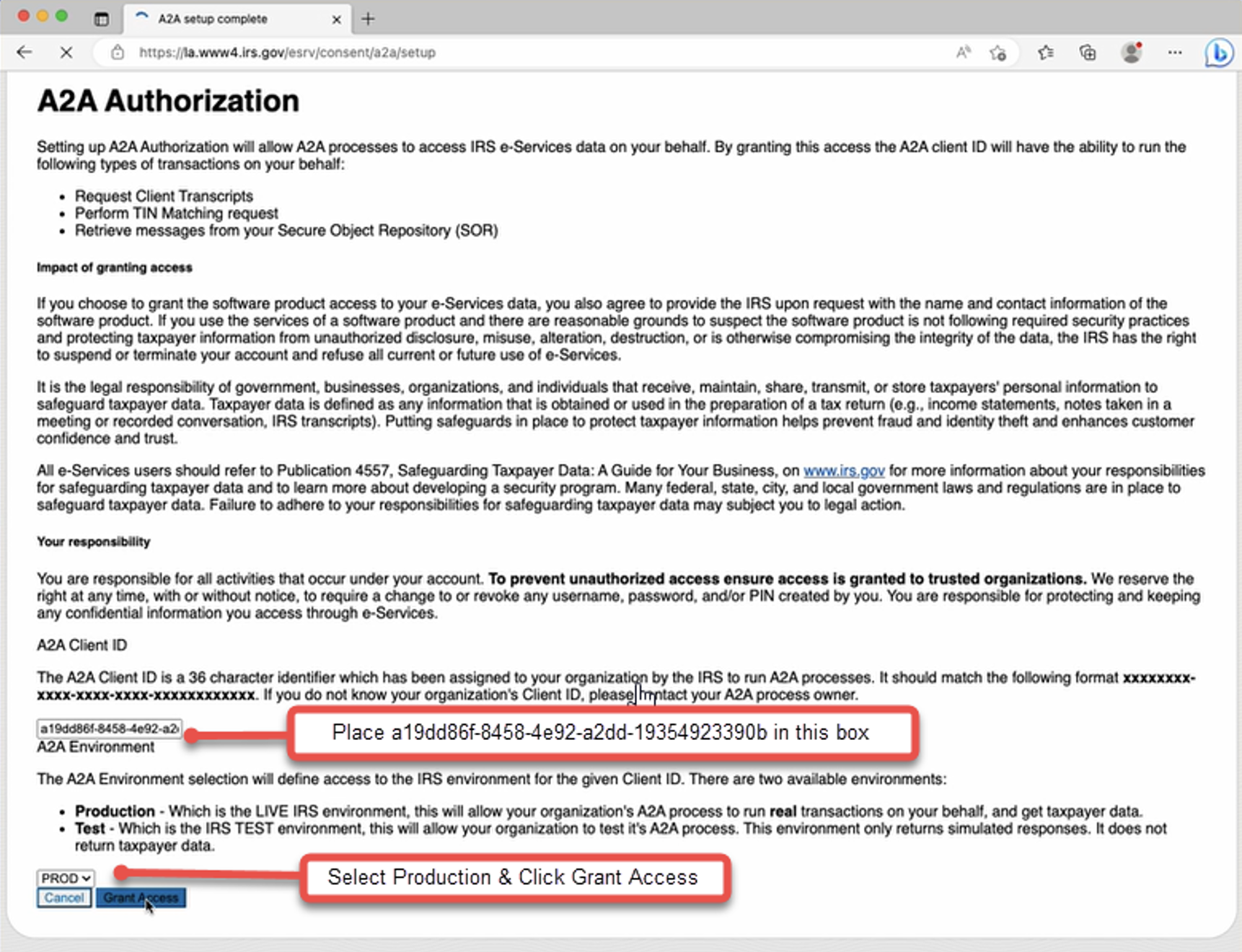 Copy and paste the TaxStatus Client ID into the form. Then select PROD and click Grant Access.