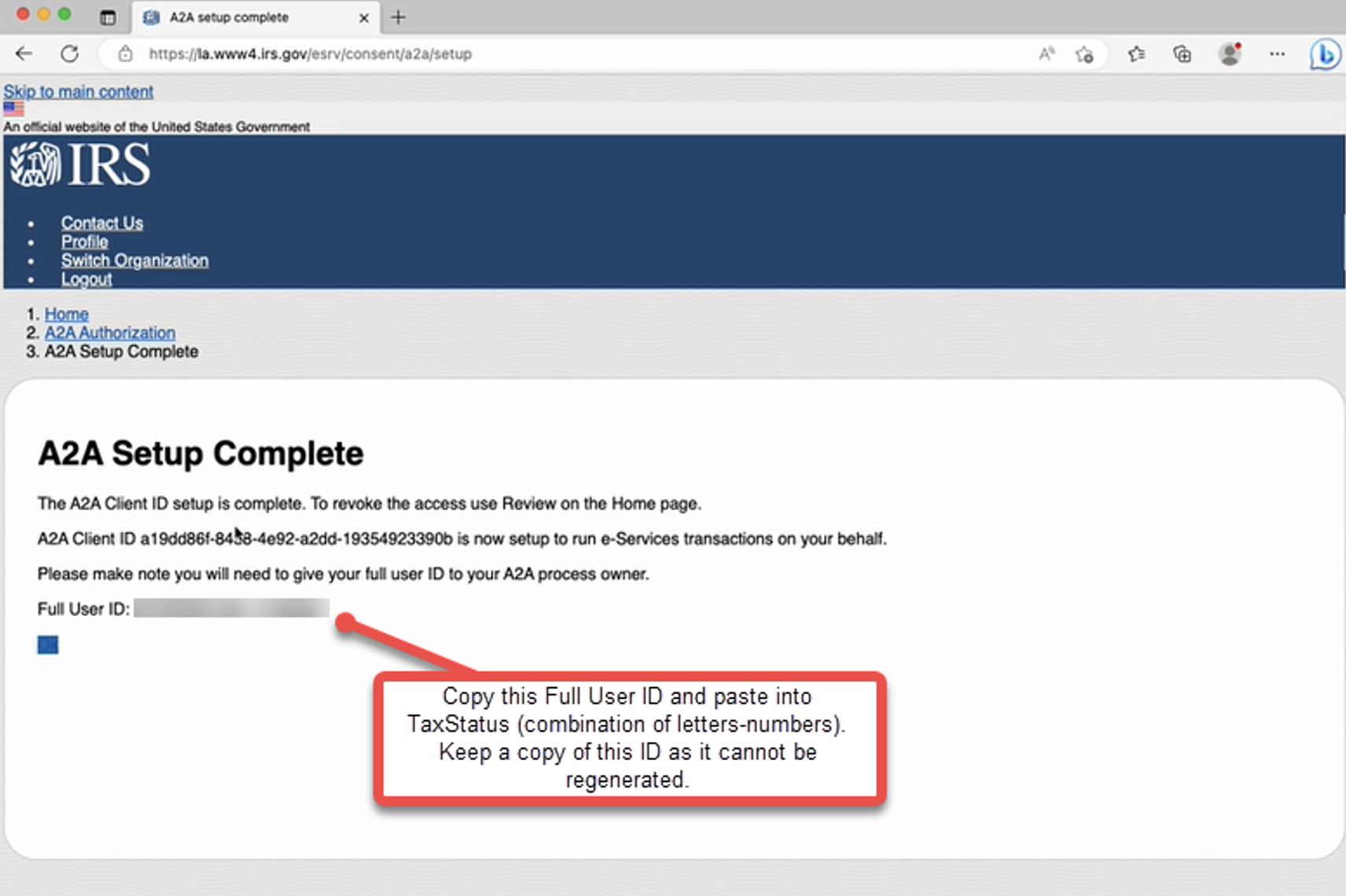 IMPORTANT!! Save this User ID. In the next step, you will need to paste it into TaxStatus.